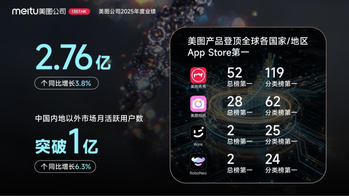 末端2025年12月31日,好意思图公司全球月活跃用户数达到2.76亿,同比增长3.8%。其中,中国内地之外商场月活跃用户数冲破1亿,同比增长6.3%。
