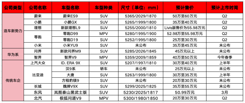 下图为虎嗅汽车整理的“9系”入局玩家及车型基本信息: