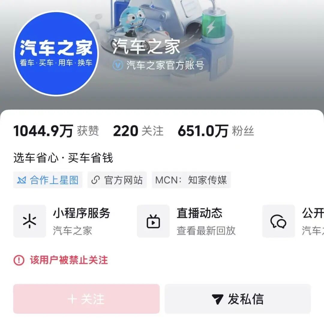 汽车之家官方认证抖音账号表示“该用户被不容照拂”,该账号领有651万粉丝;其快手、B站官方认证账号均被不容照拂,有平台教唆原因表示为“账号十分”或“违背社区法律讲明”。