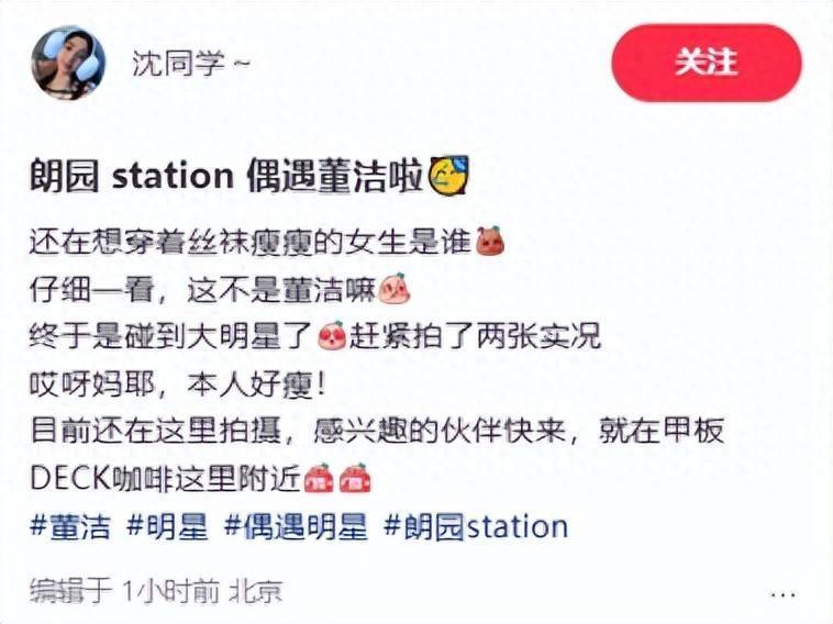 3月12日,有网友在园区偶遇正在拍摄居品宣传的董洁,近期已有不少东说念主在此屡次遇到她。